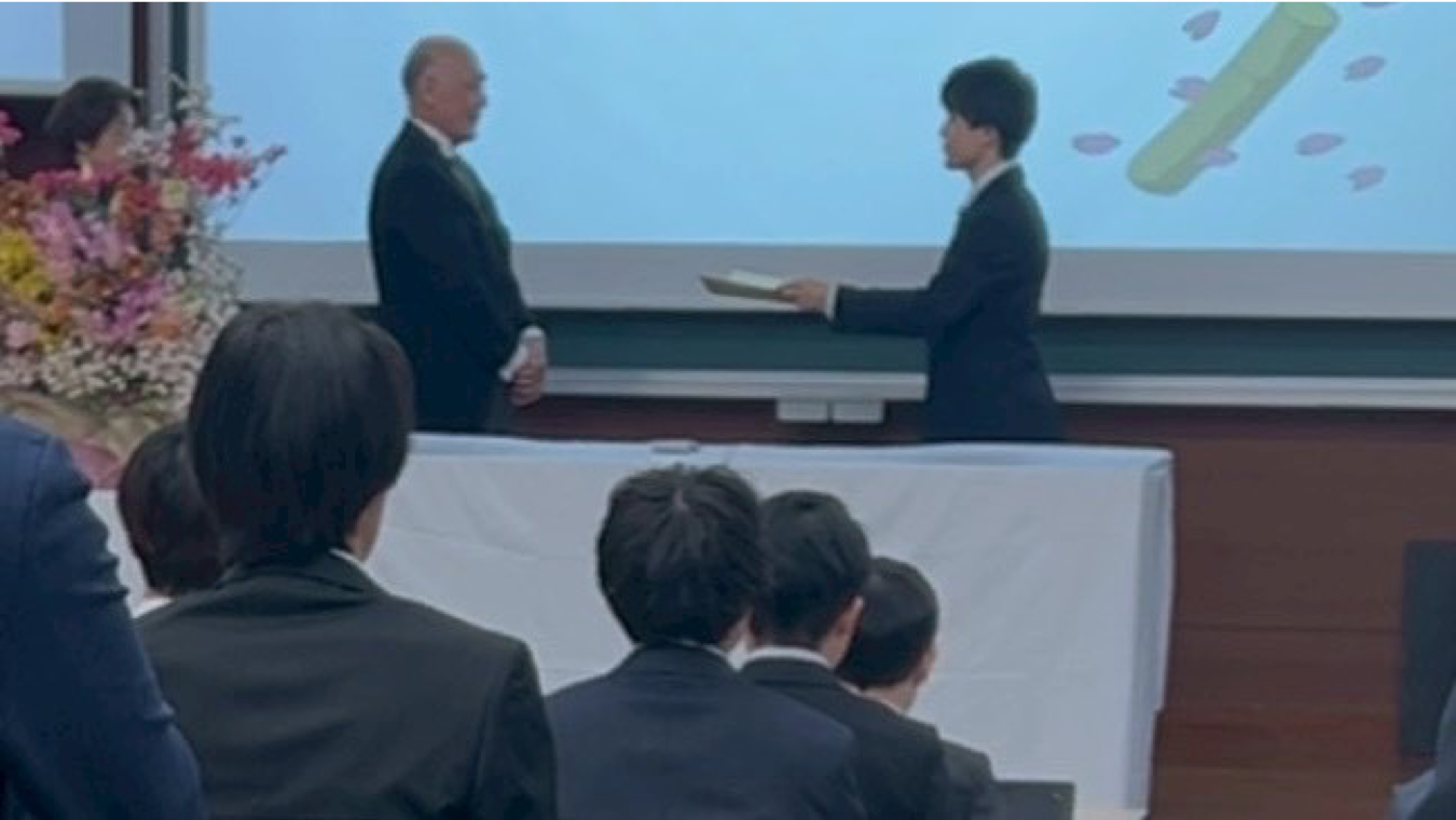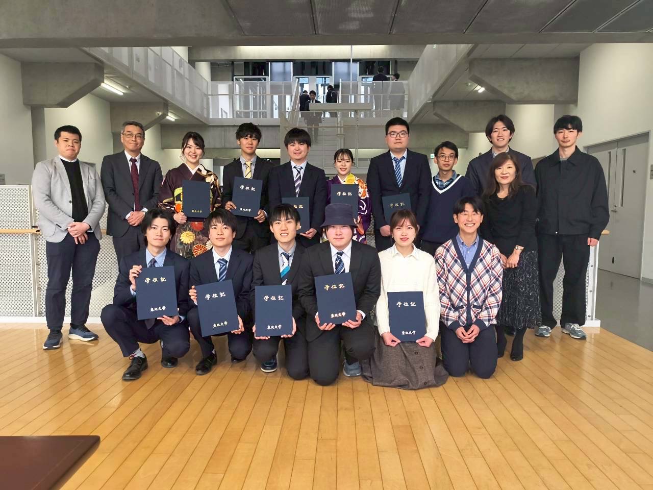 学科内卒業式で学位記を受け取る安田君。画質が悪いのはご愛嬌。