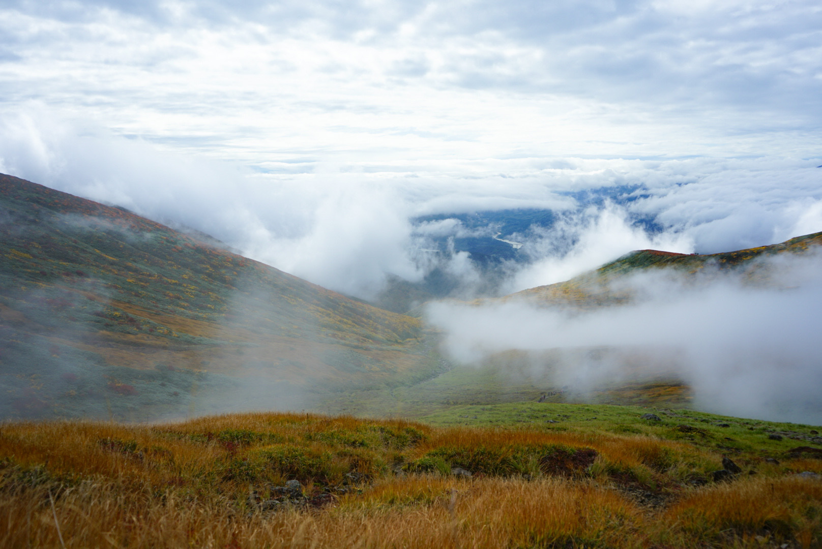 森林限界を突破し、そろそろ眺望が欲しくなってきたと思った矢先、なんとガスがみるみると流れていきました。頭上には秋晴れが、眼下には一面に雲海が広がり、月山の織り成す紅葉のモザイクアートが姿を現してくれました。登山部全員のバイブスはぶち上げです。晴れ男が真骨頂を発揮してくれたのかな...!?